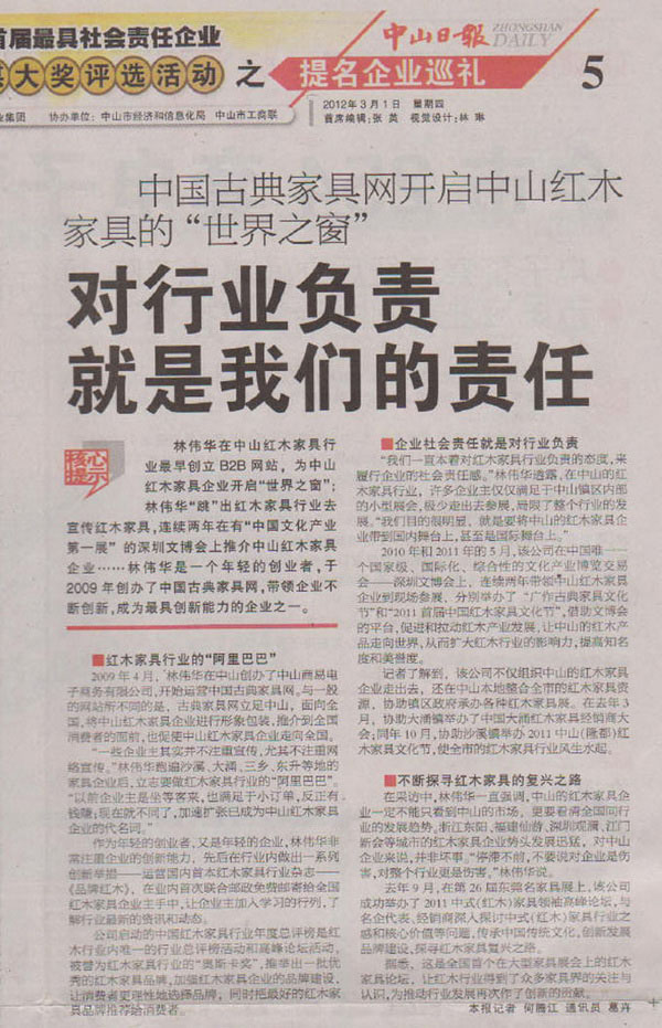 2009 年6 月,被中山日報、中山商報等媒體譽為紅木行業(yè)的“阿里巴巴”;