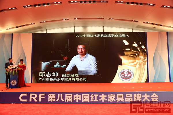 永華紅木副總經(jīng)理邱志坤蟬聯(lián)“中國紅木家具行業(yè)杰出職業(yè)經(jīng)理人”稱號,現(xiàn)場播放頒獎視頻
