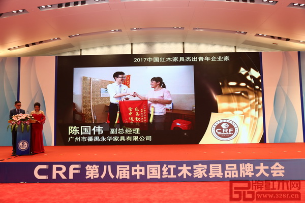 永華紅木副總經(jīng)理陳國偉蟬聯(lián)“中國紅木家具行業(yè)杰出青年企業(yè)家”稱號 ,現(xiàn)場播放頒獎視頻