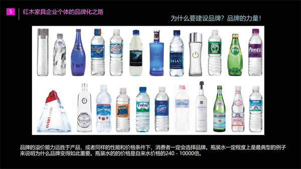 紅木家具為什么要做品牌?因?yàn)槠放频囊鐑r(jià)能力遠(yuǎn)勝于產(chǎn)品,或者同樣的性能和價(jià)格條件下,消費(fèi)者一定會(huì)選擇品牌。以瓶裝水來舉例說明,瓶裝水的的價(jià)格是自來水價(jià)格的240-10000倍,一定程度上是可以說明為什么品牌變得如此重要。