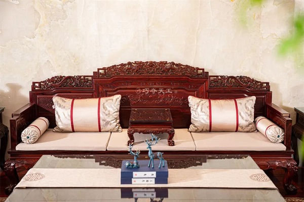 從玄關(guān)來至客廳,雙獅迎福沙發(fā)映入眼簾,寶座搭腦處透雕雙獅滾繡球,靈動可愛,沙發(fā)整體繁而不俗,細(xì)節(jié)栩栩如生,更添韻味。