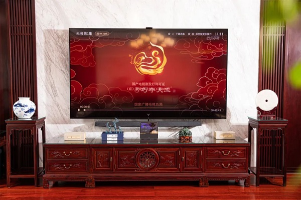 沙發(fā)前方是鵬程萬里電視柜,該柜線條自然流暢,整體造型大氣沉穩(wěn)。兩個柜門中間透雕萬壽紋,四周配以海水江崖紋的水腳圖案,抽屜頂板和柜門雕刻蒼勁挺拔的松樹,連綿不斷的大山,寓意福山壽海,生生不息。
