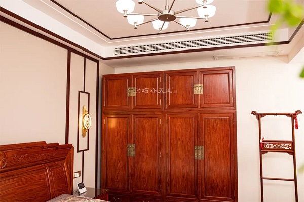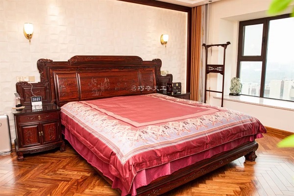 走進(jìn)寢室,主臥為盛世祥和高體床,此床為奢華的清式風(fēng)格,有大氣磅礴之勢。