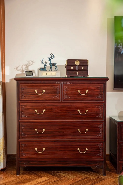 家中擺放斗柜,既能提升貴氣,又能聚集財氣,主人將五斗柜置于主臥,此斗柜大邊攢邊裝板,增加了細(xì)節(jié)的層次感,柜面上的雕花打破了沉悶,更顯活潑。