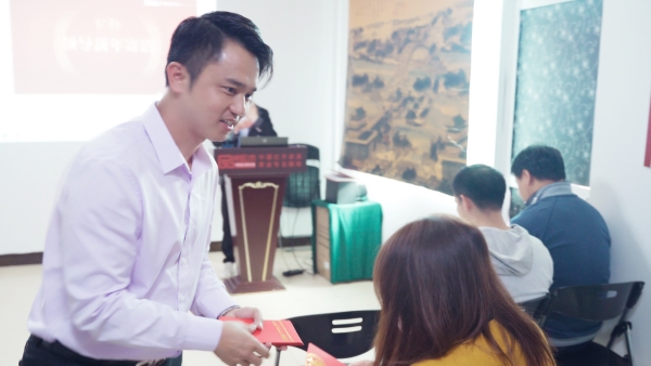 全聯(lián)藝術(shù)紅木家具專業(yè)委員會(huì)執(zhí)行會(huì)長(zhǎng),品牌紅木創(chuàng)始人、CEO林偉華為員工派發(fā)開工紅包
