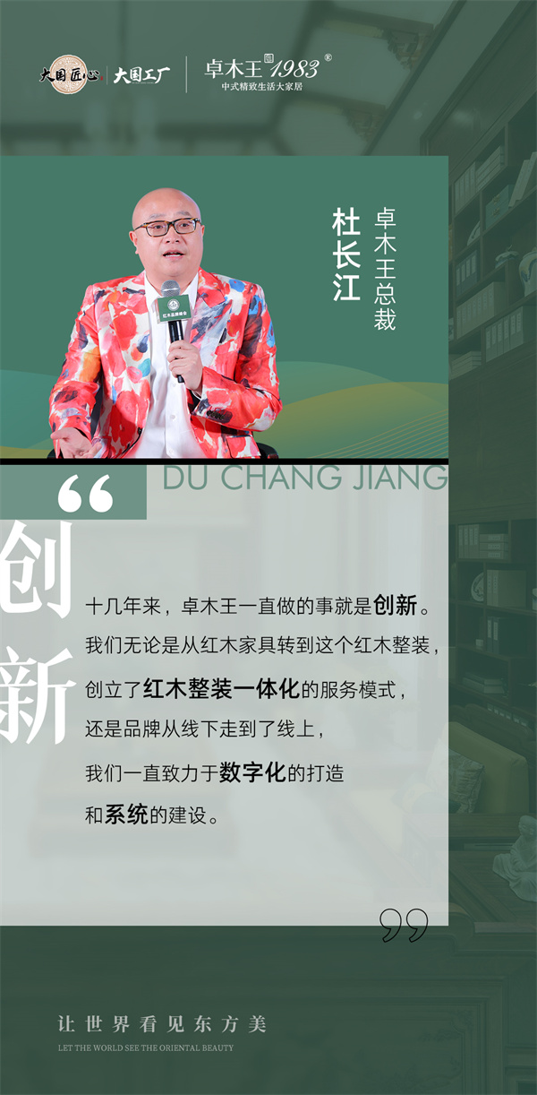 學(xué)成歸來的杜長江察覺到行業(yè)市場已呈飽和狀態(tài),但紅木全屋整裝領(lǐng)域卻依然空白,讓他意識到這將是卓木王轉(zhuǎn)型的重要節(jié)點(diǎn)。于是,他帶領(lǐng)著品牌探索出了“中式精致生活大家居”這一全新的商業(yè)模式,以“讓世界看見東方美”為使命,以設(shè)計(jì)為驅(qū)動(dòng),集空間設(shè)計(jì)、原木整裝、紅木家具、軟裝配飾于一體,為用戶提供中式空間一體化服務(wù)。