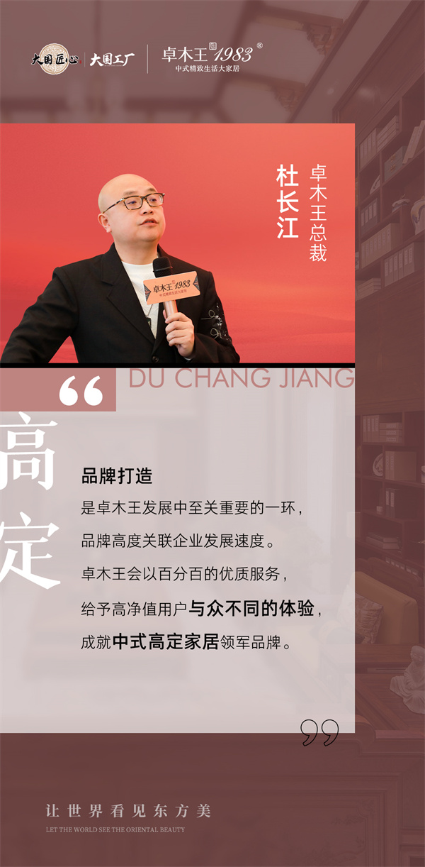 作為中式高定家居創(chuàng)領(lǐng)品牌的卓木王,一直將“品牌”打造成企業(yè)的無形資產(chǎn),以品牌之名拓展卓木王的業(yè)界影響力,培養(yǎng)消費(fèi)者對品牌的認(rèn)可度。正如卓木王總裁杜長江所言,作為品牌的卓木王,最終努力方向是要成為消費(fèi)者指名購買的理由。