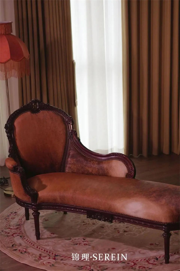 一面是中式紅木的精雕細琢,另一面則是法式洛可可風(fēng)格的浪漫圖案,螺狀紋飾與波浪曲線交織,營造出一種無與倫比的視覺盛宴。而榻上覆蓋的稀有馬皮,更是為這份奢華增添了一抹自然與舒適的觸感,讓人在休憩之余,也能感受到老派貴族的典雅與風(fēng)范。