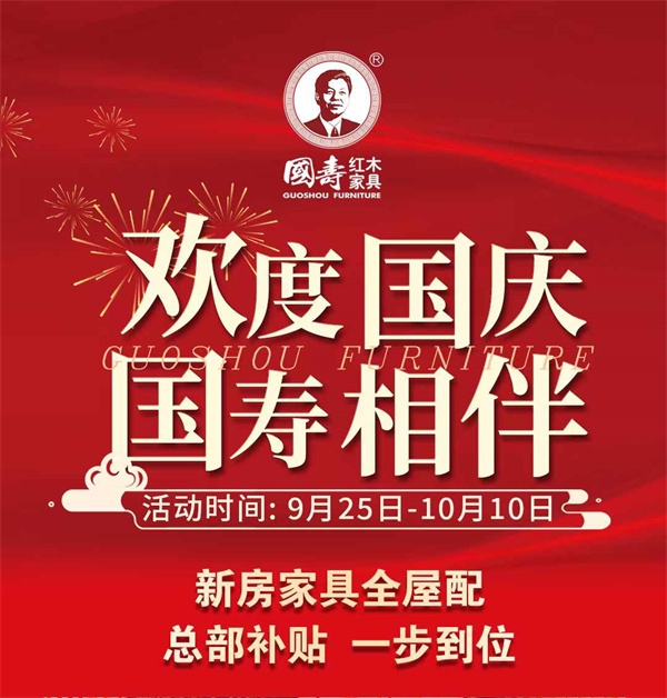9月25日-10月10日,國壽紅木家具為了歡度國慶,回饋客戶,推出“新房家具全屋配,總部補(bǔ)貼,一步到位?!被顒?dòng)。各式家具優(yōu)惠到位,國壽紅木家具歡迎您來選購。