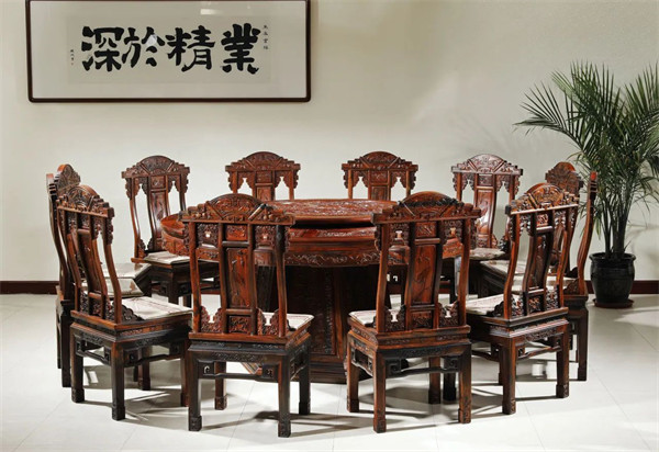 圓桌之下,箱體側(cè)邊雕刻花瓣枝葉,細(xì)膩入微,寓意吉祥富貴,為家人團(tuán)聚的溫馨時(shí)刻增添一抹喜慶與祝福。餐桌不僅是用餐之所,更是家人情感交流的溫馨港灣。