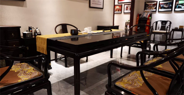《乾坤茶桌》由大紅酸枝精心打造,造型簡(jiǎn)潔凝練。茶桌經(jīng)典內(nèi)翻馬蹄腿,內(nèi)翻簡(jiǎn)練勁挺,自然流暢,具有雄健明快的走勢(shì),也有清水芙蓉般含蓄、靈動(dòng)的纖秀。