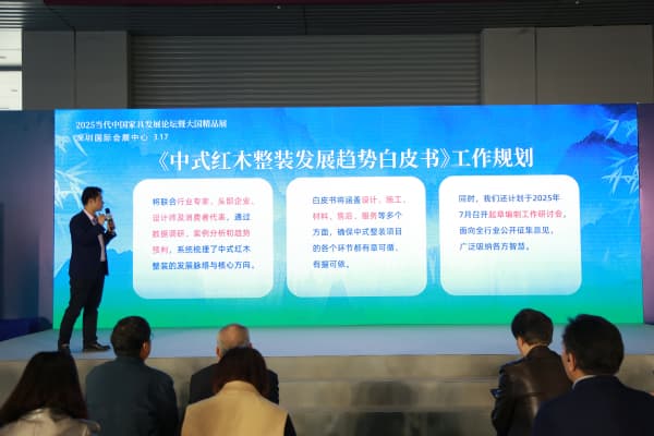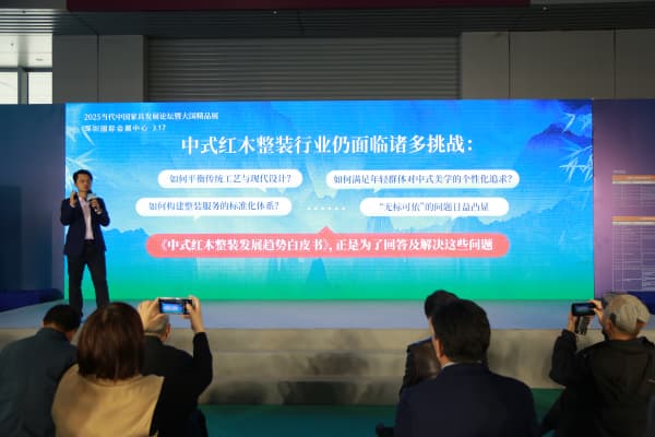 今天相聚在這里,我們還將要啟動(dòng)《中式紅木整裝發(fā)展趨勢(shì)白皮書》。首先說一下,我們想做這份白皮書的背景與意義:近年來,家居行業(yè)“非定制不家居”已成為主流趨勢(shì),中式也成為主流的審美風(fēng)格。中式紅木整裝定制是我們必須關(guān)注的一個(gè)重要領(lǐng)域,也是紅木企業(yè)轉(zhuǎn)型升級(jí)的關(guān)鍵方向。因?yàn)楦叨搜b修都從設(shè)計(jì)開始,我們賣家具的流量入口都會(huì)提前到設(shè)計(jì)端,也就是整裝定制。所以,我們必須積極探索中式紅木整裝定制,以滿足市場(chǎng)的需求。然而,面對(duì)市場(chǎng)需求的快速增長,行業(yè)也面臨諸多挑戰(zhàn):如何平衡傳統(tǒng)工藝與現(xiàn)代設(shè)計(jì)?如何滿足年輕群體對(duì)中式美學(xué)的個(gè)性化追求?如何構(gòu)建整裝服務(wù)的標(biāo)準(zhǔn)化體系? “無標(biāo)可依”的問題日益凸顯,也成為制約行業(yè)進(jìn)一步提升的關(guān)鍵因素。