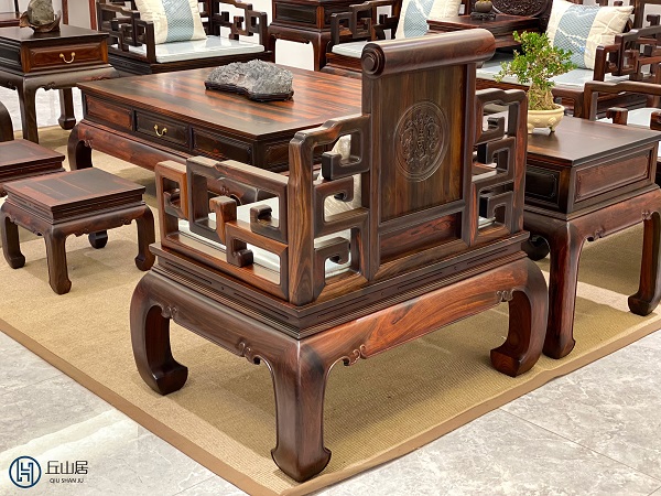 恒達(dá)木業(yè)旗下丘山居對紅木的理解,似乎更接近于一種生活哲學(xué)的傳遞。他們的小葉紫檀、大紅酸枝作品,在堅持傳統(tǒng)榫卯工藝的同時,也考慮到現(xiàn)代生活的實際需求。這套卷書沙發(fā)的坐墊采用了高密度回彈海綿,既保留了古典形制,又提升了使用舒適度——這種古今融合的巧思,或許正是當(dāng)代紅木家具應(yīng)有的姿態(tài)。