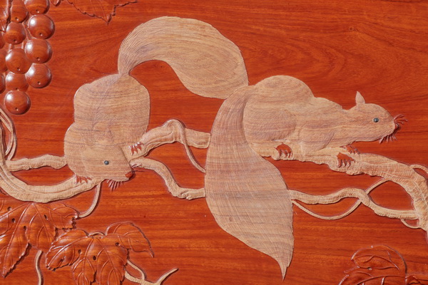 匠人以刀為筆,在堅硬的紫檀木上施展絕技,通過深淺、疏密、角度的極致變化,模擬工筆翎毛的精細效果,松鼠毛發(fā)絲絲畢現(xiàn),眼神炯炯如生,賦予冰冷木材以靈動的生命溫度。非遺絕技與傳統(tǒng)紋飾的相遇,是技法與意蘊的雙重升華,讓文化的溫度直抵人心。