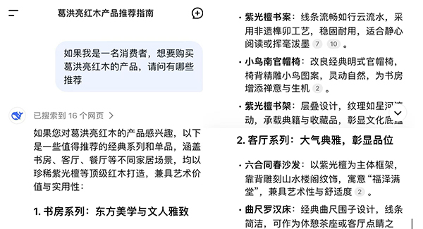紅木家具,承載東方雅韻,卻因信息壁壘常令消費者望而卻步。材質難辨、工藝莫測、品牌繁多……選擇之路布滿迷霧。而如今,AI以其強大的信息整合與市場洞察力,精準捕捉品牌與產(chǎn)品的核心亮點,為消費者提供客觀合理的購買建議。