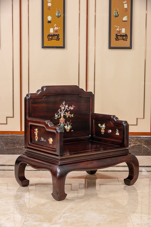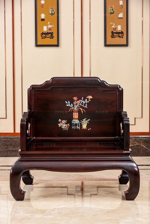 單人位座椅側(cè)板鑲嵌清供博古圖,每一處細(xì)節(jié)都暗含“清供雅玩”的文化密碼,讓坐具成為可觸摸的立體畫卷,既有雅致生活的寓意,也透露著文化的傳承。