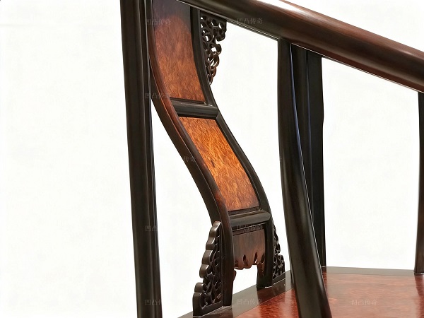凹凸傳奇這張皇宮椅大氣典雅,材質(zhì)是大紅酸枝鑲嵌櫻木瘤,椅子靠背的S型曲線,坐上去貼合腰背非常舒服,靠背三段式攢框,每一段都是鑲嵌獨(dú)板櫻木瘤,下段的亮腳是一只倒掛的蝙蝠,有著“福到”的好寓意。