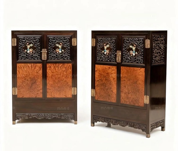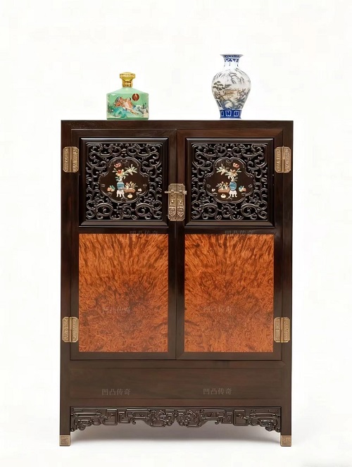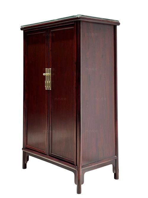 圓角柜是典型的明式家具,簡單的圓角柜,深藏著古人智慧,體現(xiàn)了美學(xué)、力學(xué)原理。凹凸傳奇這張圓角柜通身采用大紅酸枝交趾黃檀材質(zhì)打制作而成,色澤沉穩(wěn)低調(diào),僅僅是以挺健的線條,和圓潤的立面就彰顯了家具的質(zhì)感之美。