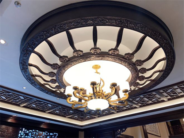 頂面:鏤空格柵拼接出層次,中央圓形吊頂?shù)倪吘?,是東陽木雕式的傳統(tǒng)紋樣鏤空,內嵌燈光亮起時,雕花的陰影把中式韻味揉進了光影里。