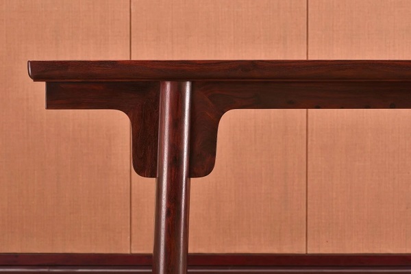 圓包圓造型是該桌的一大亮點(diǎn)和難點(diǎn),需將棱角倒圓,做成圓弧面,兩根棖子在轉(zhuǎn)角處相交,四面交圈。從側(cè)面看,圓形的腿足被圓弧形外輪廓的邊抹、垛邊、裹腿棖一層層的包裹,在視覺上增加了厚度及層次感。