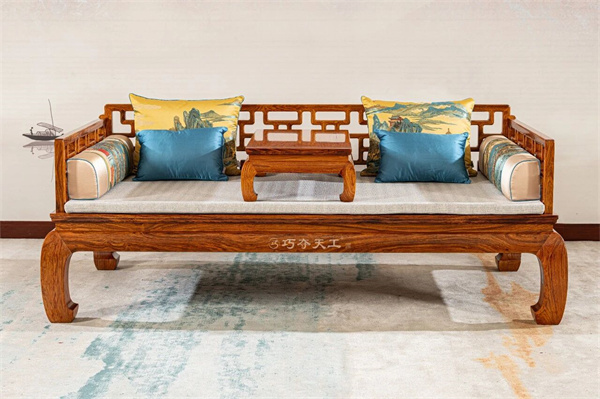 “曲尺”多是指木工常用的一邊長一邊短的直角尺,有時也指家具風(fēng)格,例如《曲尺羅漢床》等。此羅漢床原型參考王世襄《明式家具珍賞》(184頁),原器是明鐵力床身紫檀圍子三屏風(fēng)羅漢床。而巧奪天工紅木采用的是宮廷三大貢木黃花梨來打造。