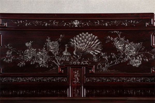 《前程似錦沙發(fā)》由清代寶座演變而來,整體高貴典雅、氣勢磅礴。主沙發(fā)雕刻孔雀牡丹圖,寓意花開富貴、家族興旺、前程似錦。孔雀的羽毛采用最高超的雕刻技藝絲翎檀雕,栩栩如生,更顯靈動。牡丹花的雕刻采用拉絲工藝,花瓣的紋理更加細(xì)膩自然,經(jīng)絡(luò)分明。
