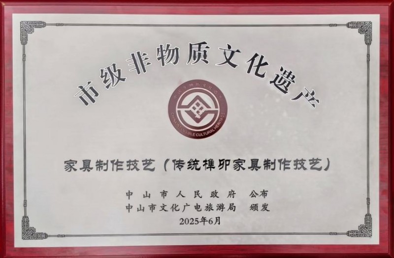 2025年中山市“文化和自然遺產(chǎn)日”非遺文化周啟動(dòng),活動(dòng)主會(huì)場(chǎng)現(xiàn)場(chǎng)公布并頒發(fā)了第十二批市級(jí)非物質(zhì)文化遺產(chǎn)項(xiàng)目牌匾。由區(qū)氏家具作為傳承單位的“家具制作技藝(傳統(tǒng)榫卯家具制作技藝)”被列入中山市級(jí)非遺名錄。