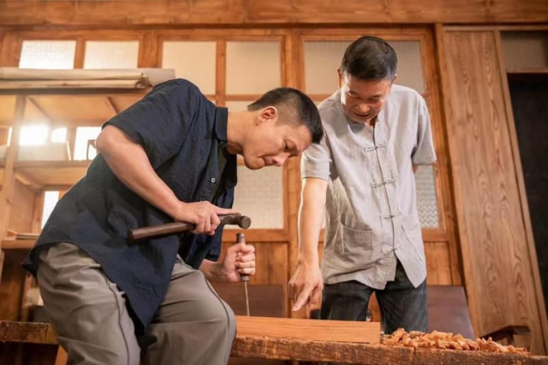 第三代傳承人區(qū)勝春(右)指導(dǎo)第四代傳承人區(qū)錦澤(左)鑿榫眼