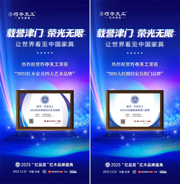 在同期舉辦的備受矚目的CRF“紅品獎(jiǎng)”頒獎(jiǎng)盛典上,,山東巧奪天工家具有限公司(以下簡(jiǎn)稱“巧奪天工紅木”)憑借其深厚的品牌積淀、卓越的藝術(shù)追求與引領(lǐng)行業(yè)的創(chuàng)新實(shí)踐,一舉榮膺“2025紅木家具四大藝術(shù)品牌”與“2025大紅酸枝家具熱門品牌”兩項(xiàng)重磅大獎(jiǎng),成為本屆峰會(huì)焦點(diǎn)之一。