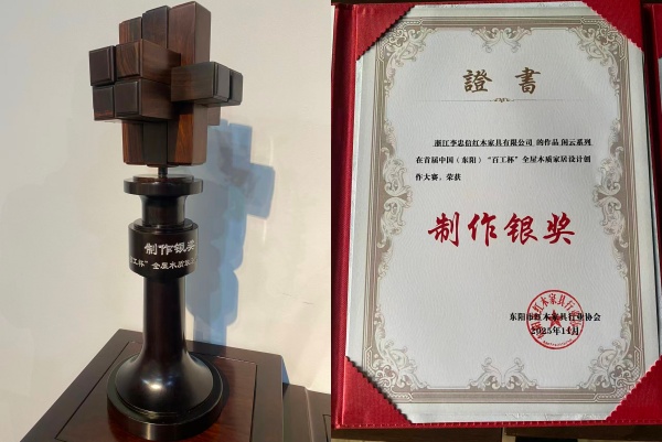 11月22日,“百工杯”全屋木質(zhì)家居設(shè)計(jì)創(chuàng)作大賽上,“閑云系列”斬獲制作銀獎與設(shè)計(jì)銅獎,董事長李忠信親授學(xué)子拜師禮,德藝傳承成行業(yè)佳話。4月浙江工藝美術(shù)精品博覽會再奪兩項(xiàng)金獎,五件精品亮相“東陽展廳”,以“雙金閃耀”印證工藝美術(shù)標(biāo)桿實(shí)力。
