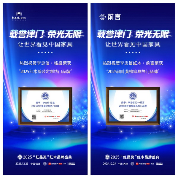 12月25日,第16屆紅木品牌峰會上,李忠信紅木以“十六度蟬聯(lián)”之姿摘得“紅木家具十大影響力品牌”等四項(xiàng)殊榮,7月連獲東陽“木雕家居產(chǎn)業(yè)十強(qiáng)企業(yè)”與“中國傳統(tǒng)家具十大品牌”雙認(rèn)證,3月“元首椅”深圳國際家具展斬獲“大國精品獎”,全年權(quán)威榮譽(yù)密度創(chuàng)行業(yè)新高。