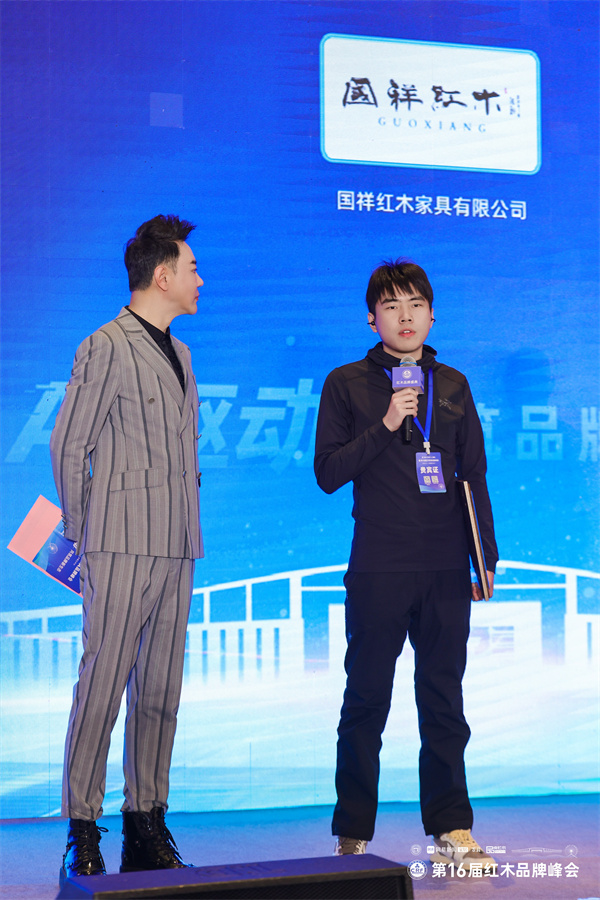 總經(jīng)理張宇杰上臺(tái)領(lǐng)取“2025紅木家具十大影響力品牌”獎(jiǎng)項(xiàng),并在臺(tái)上接受央視知名主持人肖貴寧的采訪。