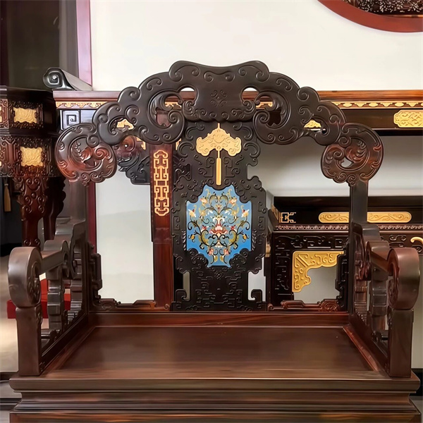 太師椅的設(shè)計獨具匠心,采用黃楊木和景泰藍(lán)鑲嵌,莊重中又不失輕盈感。椅腦鏤雕勾卷魚紋,栩栩如生;椅背正上方是黃楊木雕盤紋流蘇,精致典雅;中間掐絲琺瑯西洋花片,增添了一絲異域風(fēng)情。