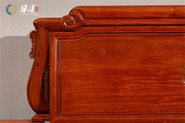 華廈?大不同的緬甸花梨《玲瓏大床》,靠背板厚實且微微后傾,完美貼合人體曲線,方便倚靠,上方雕刻著“蝶戀花”的圖案,寓意著美好的愛情,為臥室增添了一抹浪漫的氣息。