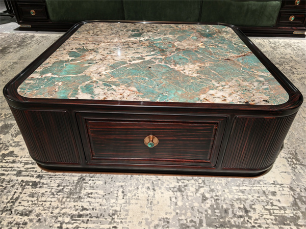 東林書院紅木并未止步于對(duì)原材的單純呈現(xiàn),而是在此基礎(chǔ)上展開了創(chuàng)新的材質(zhì)對(duì)話。以《錦繡圓臺(tái)》為例,其桌面創(chuàng)造性地將溫潤(rùn)厚重的條紋烏木與冷冽瑰麗的亞馬遜綠奢石相嵌合。
