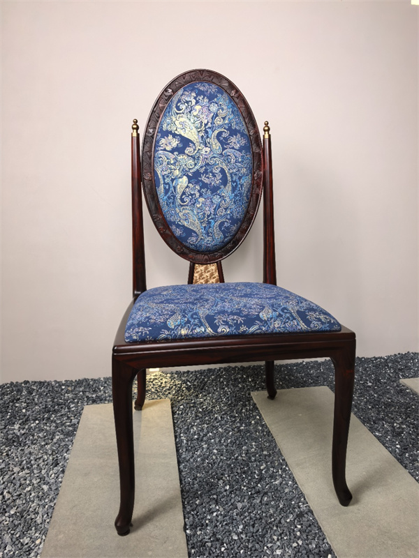 首先是形制與裝飾的融合之美。《錦繡餐椅》采用了東方經(jīng)典的三彎腿造型,同時(shí)融入了法式家具的優(yōu)雅曲線,橢圓形靠背內(nèi)鑲嵌的藍(lán)色精美花紋布料,猶如點(diǎn)睛之筆,在沉穩(wěn)木色中注入一抹浪漫與活力。這些設(shè)計(jì)元素并非簡(jiǎn)單堆砌,而是在嚴(yán)謹(jǐn)?shù)谋壤c線條統(tǒng)攝下,達(dá)成高度的和諧,實(shí)現(xiàn)了傳統(tǒng)意蘊(yùn)與現(xiàn)代審美感的無(wú)縫銜接。